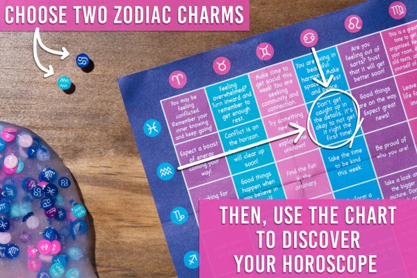 This horoscope-themed tactile toy-in-a-tin is a sparkly clear putty base filled with a constellation of charms, each imprinted with one of twelve zodiac signs. In addition to stress-reducing sensory putty, an intuition wheel and chart is included to mystically guide you as you chart each day ahead.